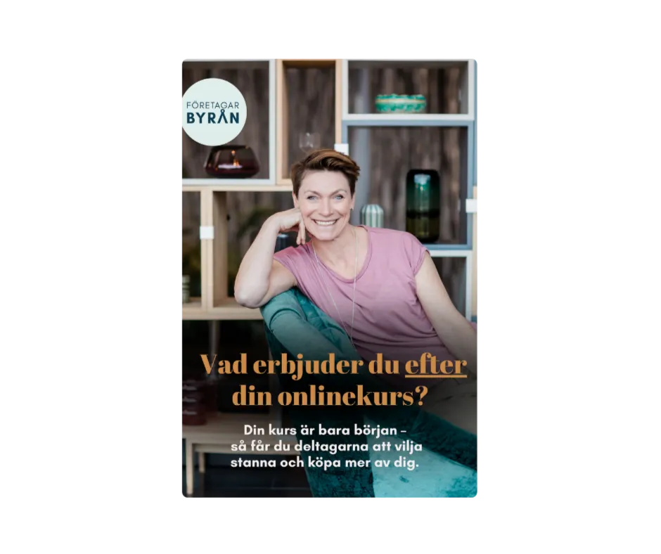 Guiden är kostnadsfri och skriven av Jill Nyqvist, onlineexpert på Företagarbyrån. För dig som säljer onlinekurser och vill ha ett mer stabilt och lönsamt företag utan att jobba dubbelt så mycket.